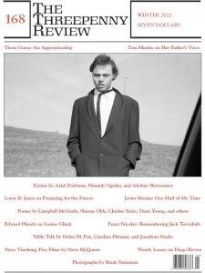 The Threepenny Review is a well-regarded quarterly of the arts and society which has been published since 1980. Every issue contains excellent essays, stories, poems, and memoirs, plus beautiful black-and-white photographs. Its regular writers include six Nobel Prizewinners and four U.S. Poet Laureates; recent issues featured writing by Wendell Berry, Geoff Dyer, Louise Glück, Greil Marcus, Javier Marías, Adam Phillips, and Kay Ryan.