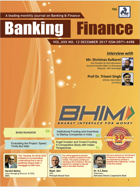 *** The December 2017 issues brings you the latest update about the latest development in the banking and financial sector in India. The issue covers the latest development in banking, housing, mutual fund and the financial sector. We have covered articles focussing on Evaluating the Project: Speed Thrills but Kills!-Dr B K Mukhopadhyay, BHIM Invasion-Prabhat singh Suman,Institutional Funding and Incentives to Startup Companies in India-Dr. A. Amruth Prasad Reddy, Dr. S. Subba Reddy & K. Maddileti,Angel investor and crowd funding a comparative study with Indian perspectives-Dr. N. R. Nagarajan & M. J. Senthilkumar. Apart from above there are several regular features, News, Updates from the industry. ***