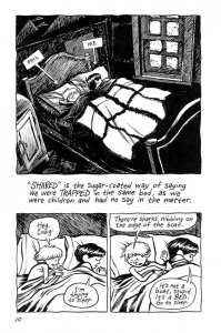 Blankets (2003) : Blankets is a story of self-discovery behind a mask of religion and limited possibilities. As a coming-of-age autobiography, the book tells the story of Thompson’s childhood in a Evangelical Christian family, his first love, and his early adulthood. However, the story also relates to other cultural and emotional issues not entirely directed at Thompson that can be placed in a moralised viewpoint.