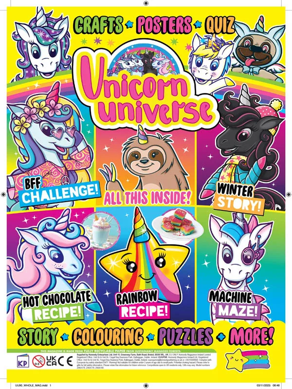 Step into a world of magic, friendship and imagination with Unicorn Universe! Packed with puzzles, games, stories, poems, makes and bakes, this is the ultimate unicorn mag! Join the Unicorn Squad and discover the amazing worlds with your new BFFs - Nova, Lexi, Luna, Phoebe and Comet! Filled with unicorns, mermaids, narwhals and more, Unicorn Universe is the most magical place EVER to explore!