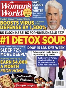 Want to be thinner, happier, healthier and less stressed? Welcome to Woman's World! Every page of this top-selling magazine is packed with great ideas for making your week easier and more fun! You'll find the latest weight-loss breakthroughs, easy money-saving tricks, mouthwatering recipes, inspiring real-life stories, family fun, and expert advice to help you live longer and look and feel your best!