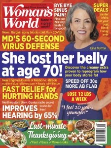 Want to be thinner, happier, healthier and less stressed? Welcome to Woman's World! Every page of this top-selling magazine is packed with great ideas for making your week easier and more fun! You'll find the latest weight-loss breakthroughs, easy money-saving tricks, mouthwatering recipes, inspiring real-life stories, family fun, and expert advice to help you live longer and look and feel your best!